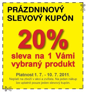 Užijte si nákup s 20 % slevou na jeden Vámi vybraný produkt.Slevové kupóny jsou k dostání na zadní straně magazínu Pet Center, který je volně k odběru ve stojanu před prodejnou Pet Center.