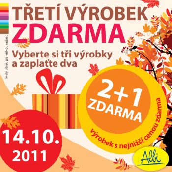 Kupte si v prodejně Albi v pátek 14. října jakékoliv tři výrobky a zaplaťte jen dva. Výrobek s nejnižší cenou od nás dostanete zdarma jako dárek.