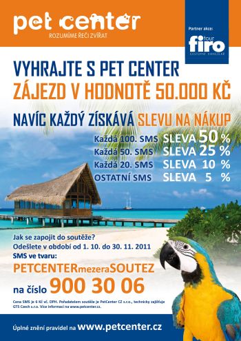 Kdo by nechtěl s příchodem chladného počasí navštívit teplé kraje nebo prožít dovolenou v pořádné exotice. Pet Center Vám tuto možnost nabízí. V období od 1. října do 30. listopadu 2011 zašlete soutěžní sms a hrajte o 50.000 Kč na Vámi vybraný zájezd. V průběhu soutěže bude odměněn každý! Zasláním soutěžní sms získáte slevy na celý nákup v hodnotě 50%, 25%, 10%, 5% a jeden z Vás pak hlavní výhru.