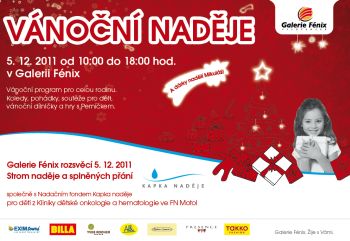 5.12.2011 od 10 do 18 hodin bude probíhat vánoční program pro celou rodinu. Galerie Fénix rozsvěcí Strom naděje a splněných přání společně s Nadačním fondem Kapka naděje pro děti z kliniky Dětské onkologie a hematologie FN Motol.