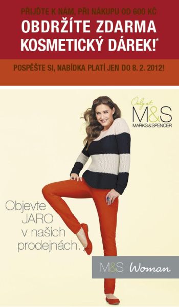 Přijďte k nám, při nákupu od 600 Kč získáte kosmetický produkt zdarma. Akce platí do 8.2.2012 nebo do vydání zásob. Více informací k akci najdete přímo na naší prodejně Marks & Spencer. Těšíme se na Vás!