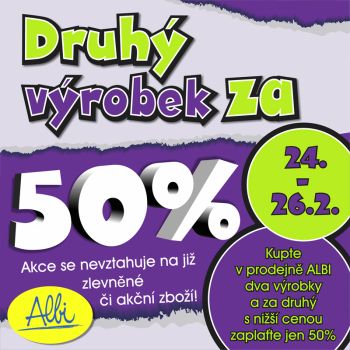 Druhý výrobek za 50%Přijďte na prodejnu Albi, kupte jakékoliv dva výrobky a za druhý s nižší cenou zaplaťte jen polovinu! Akce probíhá o víkendu od 24. do 26. února.