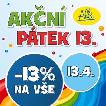 Akční pátek 13. v prodejně AlbiPřijďte na prodejnu Albi v pátek 13.dubna a získejte slevu 13% na vše.