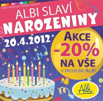 Prodejna Albi slaví narozeniny a proto jsme pro Vás k této příležitosti připravili velkou akci. V pátek 6. dubna nakoupíte v Albi prodejně vše se slevou 20%.