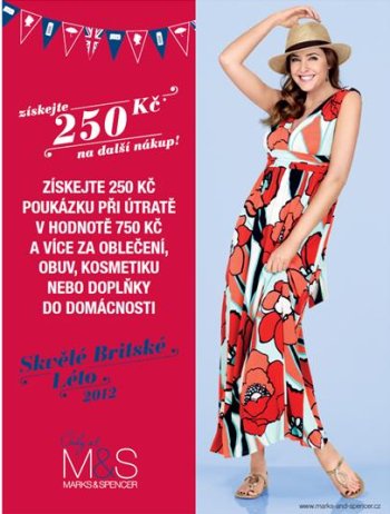 Skvělé britské léto v Marks & Spencer! Pouze nyní, za každý nákup v Marks & Spencer od 750 korun dostanete jako dárek poukázku na další nákup v hodnotě 250 Kč! Nenechte si to ujít! Více informací o této akci najdete o nabídkou na www.marks-and-spencer.cz nebo v našich prodejnách.