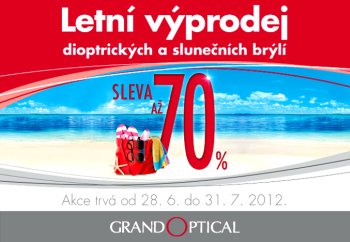 "Pořiďte si nyní sluneční i dioptrické brýle za výhodnou cenu. Sleva se vztahuje na vybrané obruby a sluneční brýle. Nabídka na obruby platí pouze při nákupu kompletních brýlí (brýlové čočky + obruba). Akce trvá od 28. 6. 2012 do 31. 7. 2012, nebo do vyprodání zásob. Více informací na www.grandopitcal.cz "