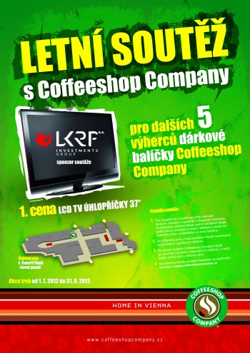 Je tu léto a spolu s ním i čas dovolených a odpočinku. Coffeeshop Company však neodlétá za sluníčkem, zůstává doma a pro všechny milovníky dobré kávy připravila jedinečnou letní soutěž. Přijměte pozvání na lahodné občerstvení s příjemnou obsluhou v kavárnách Coffeeshop Company a vyhrajte LCD TV s úhlopříčkou 37", nebo jeden z pěti dárkových balíčků Coffeeshop Company. Jak na to? Je to jednoduché!