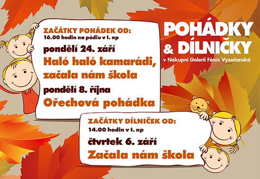Po letních prázdninách jsou tu opět Vaše oblíbené pohádky a dílničky pro děti.Pohádky začínají vždy v 16:00 hod a dílničky v 14:00 hod. Těšíme se na Vás!!