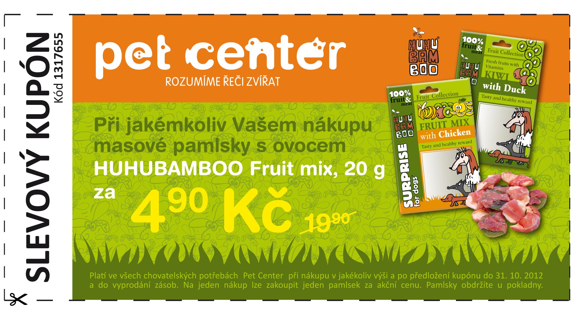 VYTISKNĚTE si slevový kupón a navštivte prodejnu Pet Center, kde na Vás čekají k jakémukoliv nákupu masové pamlsky s ovocem HUHUBAMBOO za 4,90 Kč.