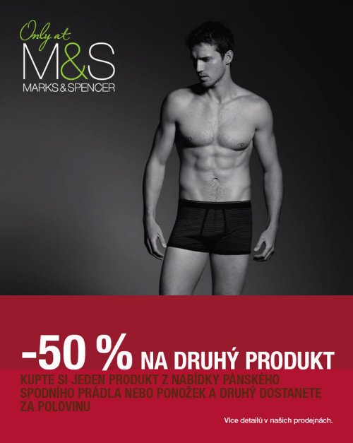 Přijďte a využijte akci na sortiment pánského spodního prádla a ponožek! Kupte jeden produkt a druhý máte za polovinu. Nabídka platí od 10.1. do 23.1.2013 v prodejně M&S na označené produkty. Více detailů v prodejně.Těšíme se na Vaši návštěvu!