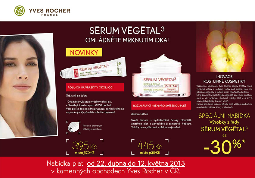 Nabídka platí od 22. dubna do 12. května 2013 v kamenných obchodech Yves Rocher v ČR. Více informací na www.yves-rocher.cz. Nově nás najdete také na Facebooku www.facebook.com/YvesRocherCR