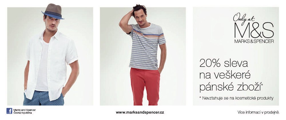 Přijďte a využijte 20% slevu na veškeré pánské zboží z naší nejnovější letní kolekce. Akce platí od 27. 5. do 2. 6. 2013, neplatí na kosmetické produkty. Více informací najdete v naší prodejně.