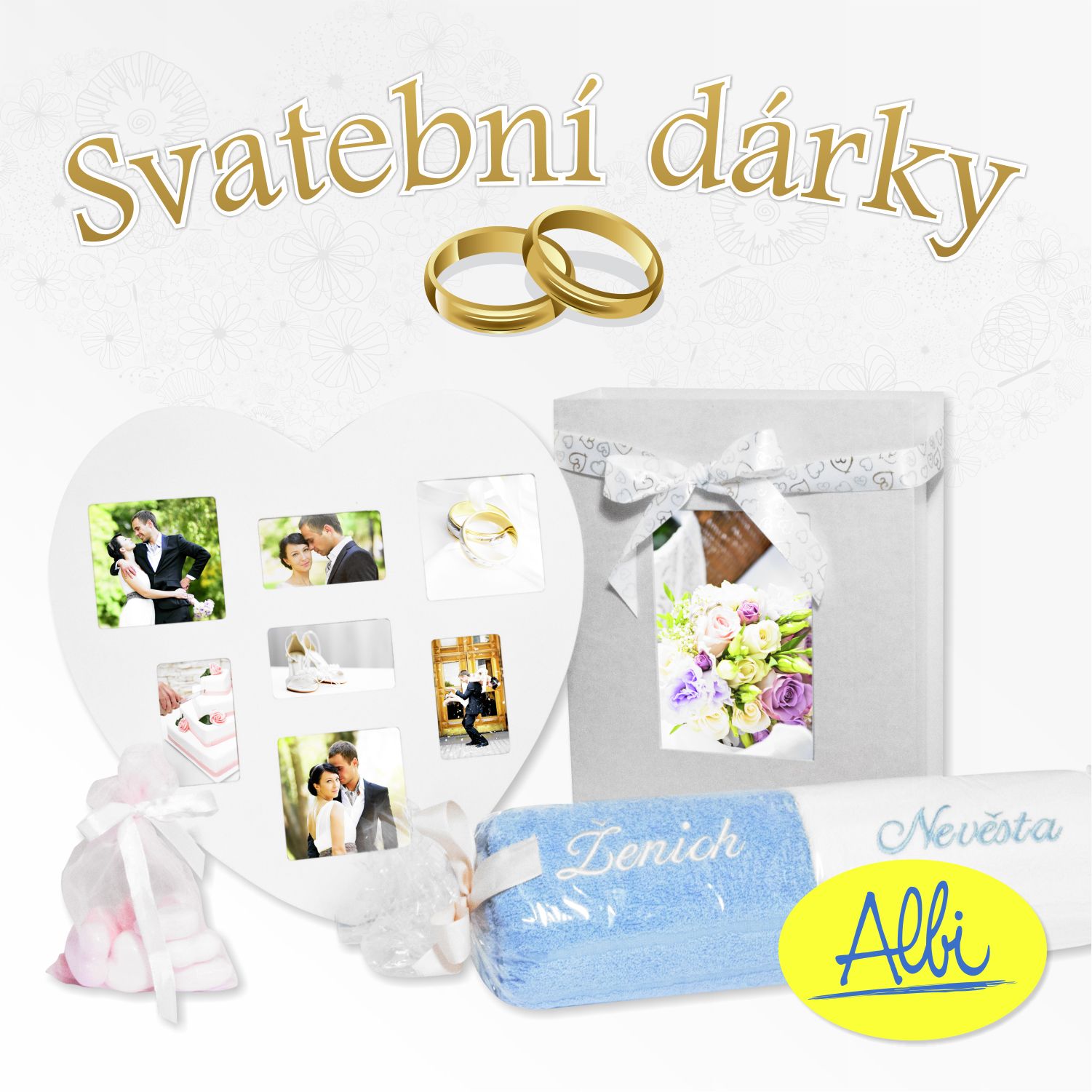 Vyberte si z celé škály nápaditých svatebních dárků - společný bryndák pro novomanžele, svatební víno s věnování, sprchový gel pro ženicha a nevěstu, vtipné ponožky, podvazky, svatební knihu a další.