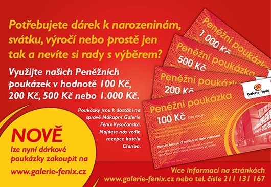 Peněžní poukázky Galerie Fénix můžete koupit na správě GF a nyní nově i objednat online zde. Jejich platnost je rok od data vystavení a platit jimi můžete ve vybraných obchodech Galerie Fénix.